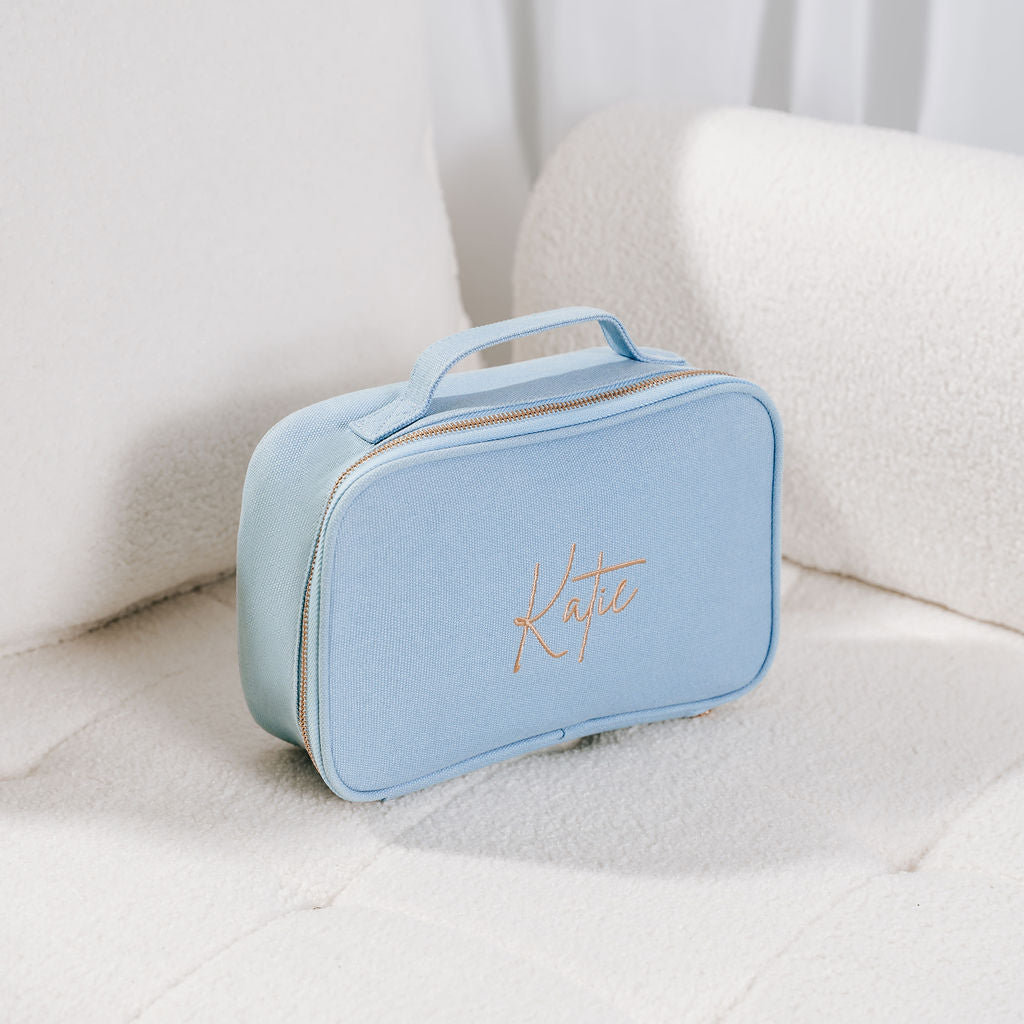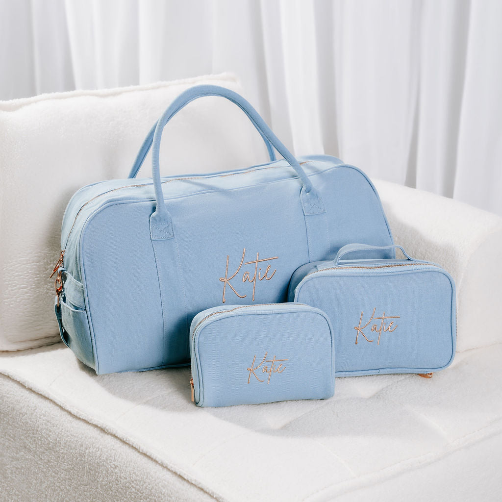 We've used rose gold thread and font 16 on the dusty blue duffle bag!