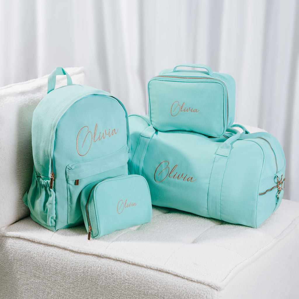 All pieces are crafted from premium cotton canvas, fully lined, and finished with luxury rose-gold zippers and hardware.