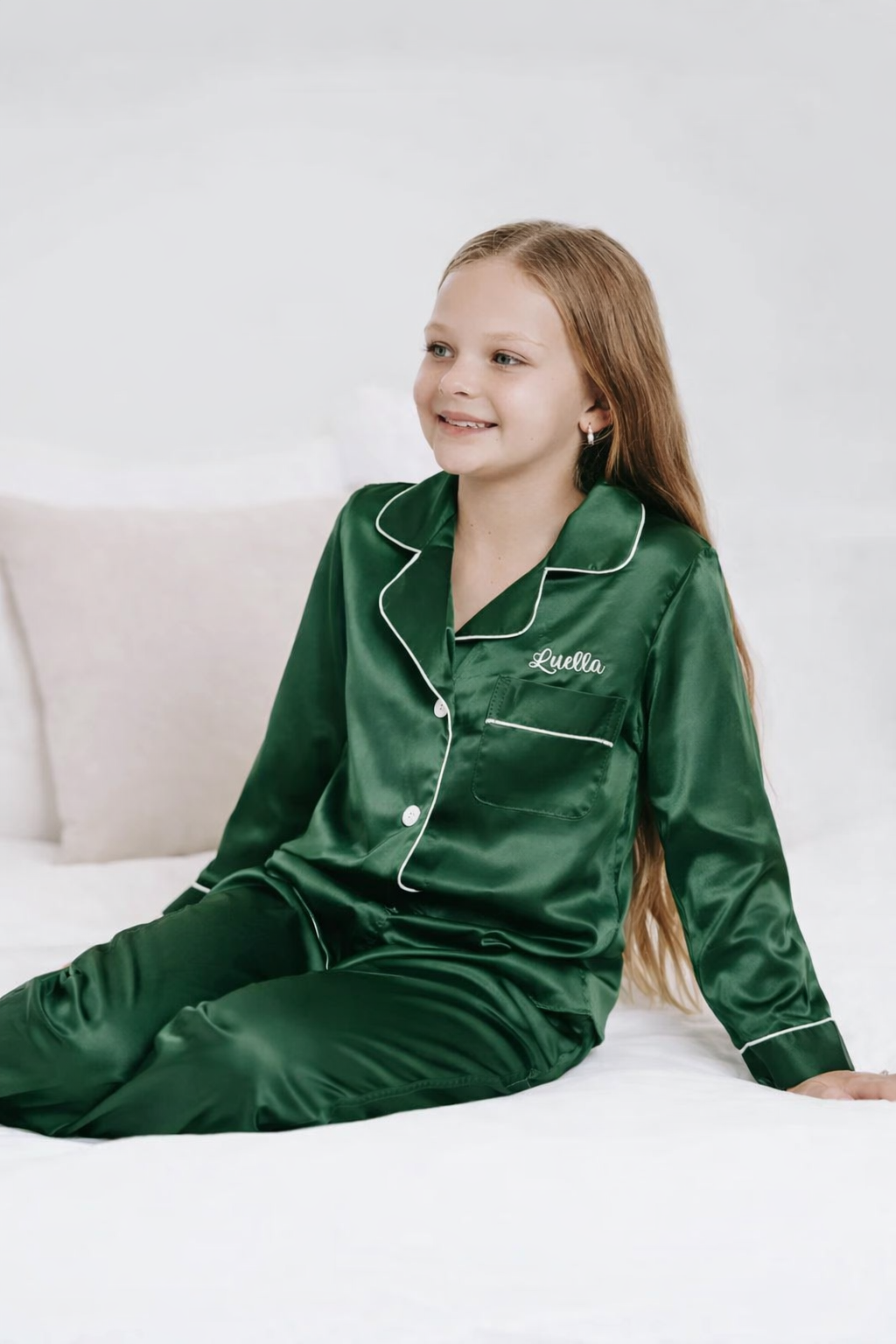 Young girl wearing green satin pajamas with a visible brand logo on a white couch.